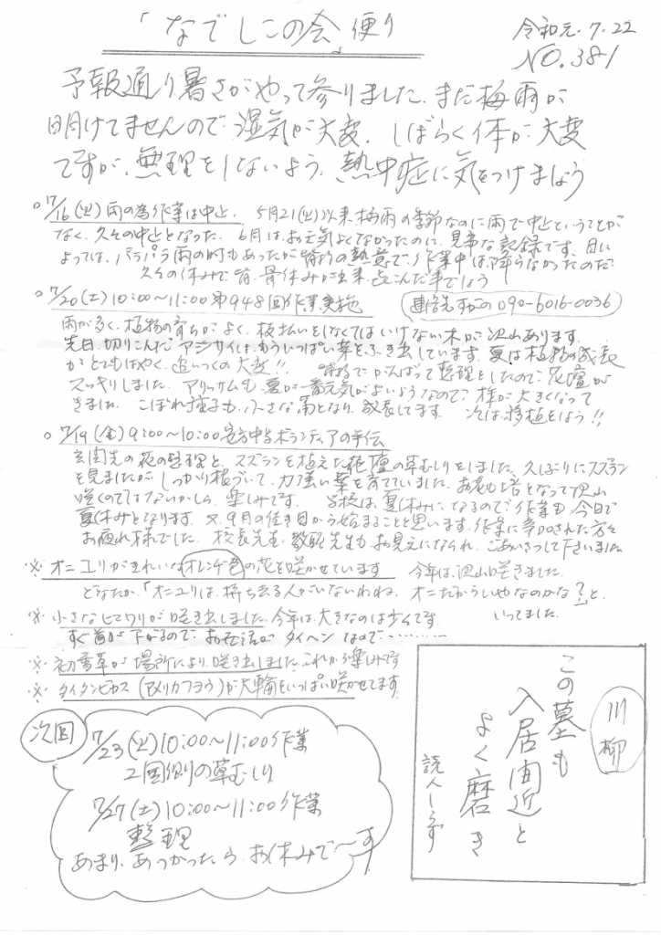 「なでしこの会」便りNo.381